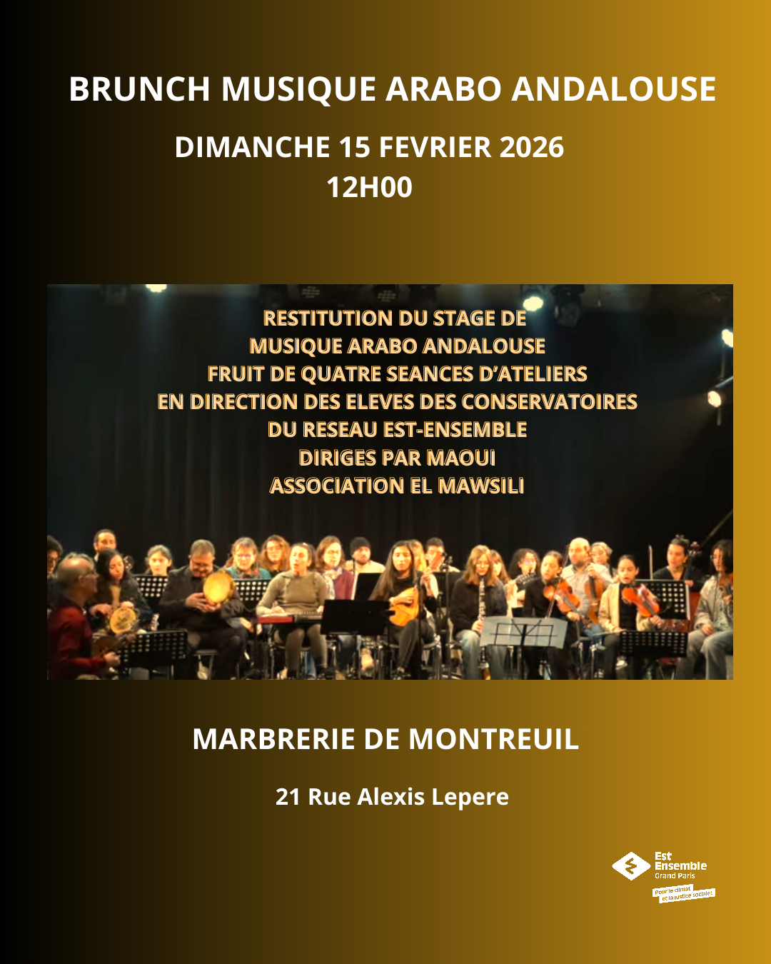 Le conservatoire de Bagnolet pour ce brunch de février, propose de présenter une restitution du stage de musique Arabo Andalouse, fruit de cinq séances d’ateliers en direction des élèves des conservatoires du réseau est-ensemble dirigés par Maoui association El Mawsili.