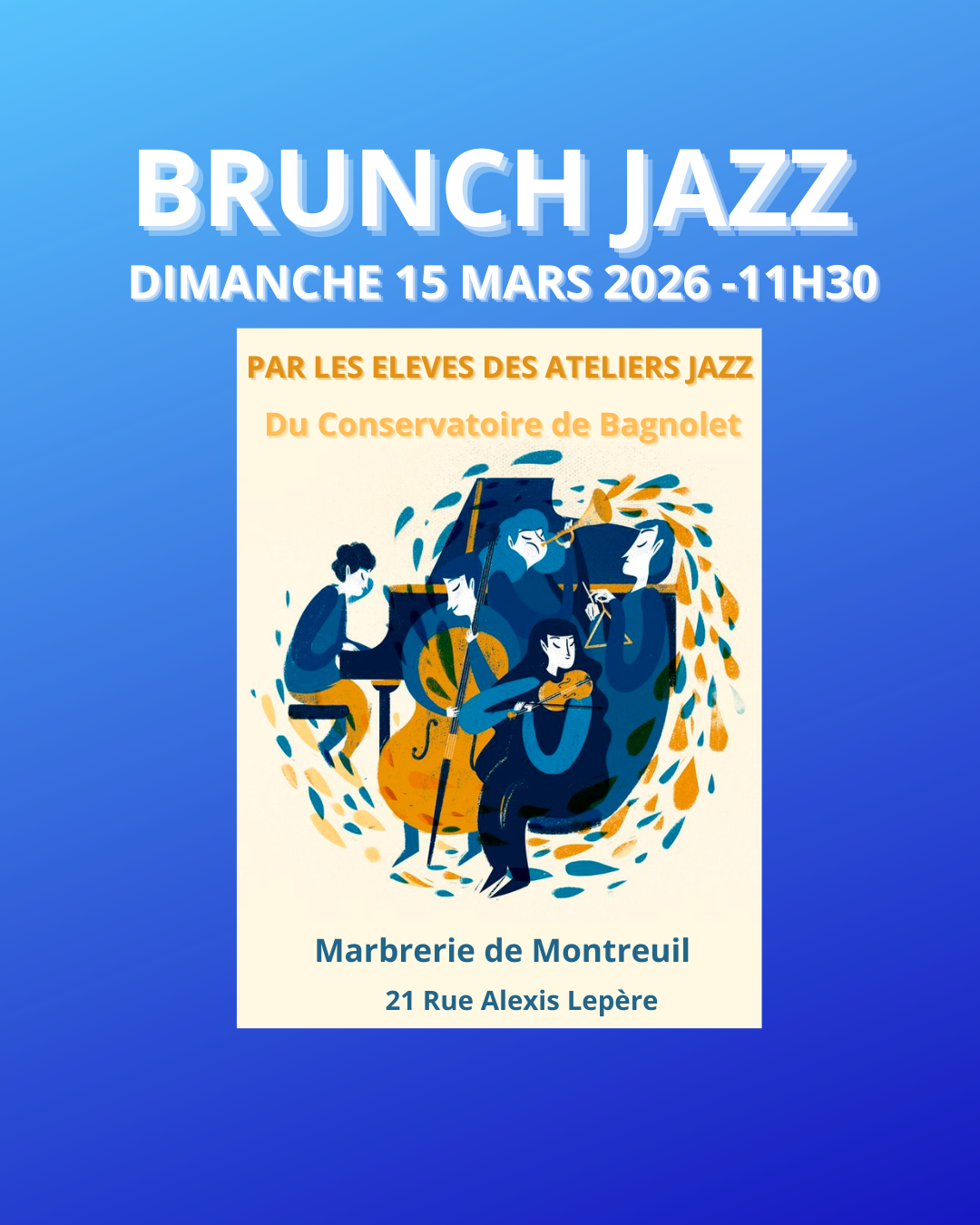 Dimanche 15 mars, le jazz sera de retour pour le brunch de la Marbrerie avec les ateliers du conservatoire de Bagnolet.