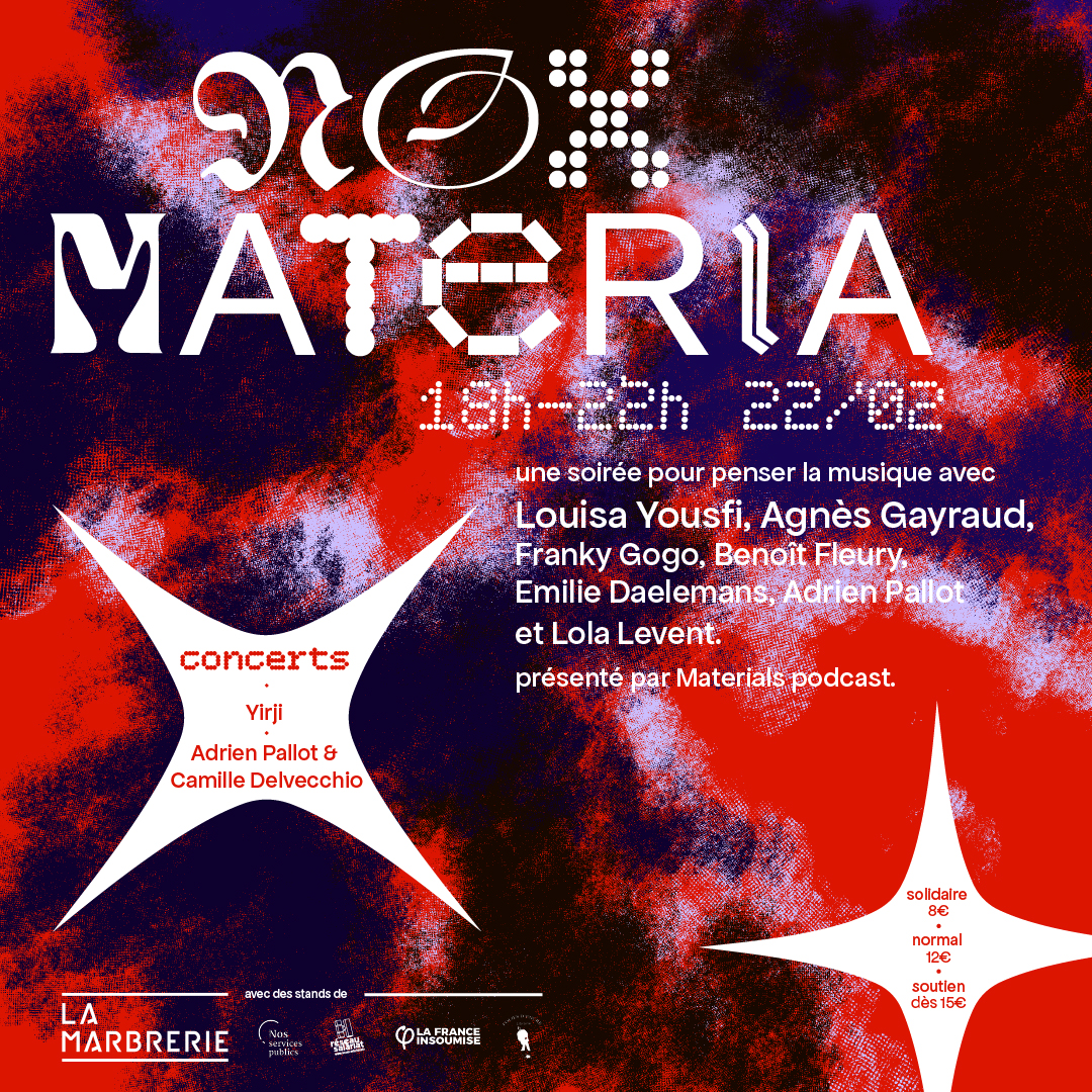 Nox materia est une soirée d’expérimentation. Soirée-bilan de la première saison du podcast de théorie musicale Materials, c’est un moment collectif de collecte de pensées pour le futur des travaux du podcast mais aussi pour l’établissement d’une théorie stratégique et offensive pour la défense de la musique et de ses travailleur·euse·s.